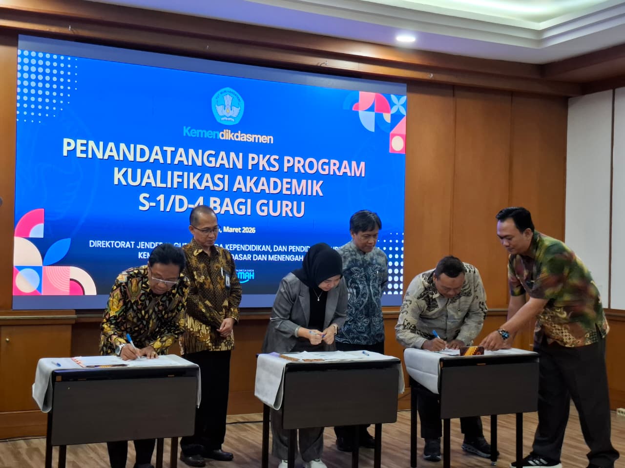 Jakarta, 7 Maret 2026 - Dalam rangka memperkuat kualifikasi guru, Kementerian Pendidikan Dasar dan Menengah (Kemendikdasmen) melalui Direktorat Jenderal Guru, Tenaga Kependidikan, dan Pendidikan Guru (Ditjen GTKPG) melakukan penandatanganan Perjanjian Kerja Sama (PKS) dengan 113 Lembaga Pendidikan Tenaga Kependidikan (LPTK) terkait program Pemenuhan Kualifikasi Akademik S-1/D-IV bagi guru.